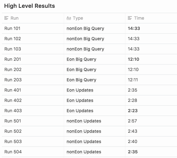 We created two test suites: Star Schema Crosstabs (Eon = 19.58% faster) Updates & Inserts (Eon = 7.75% faster)